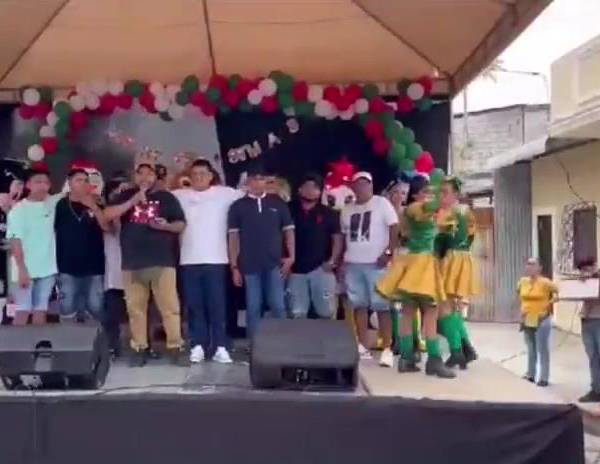 En el video se observa una tarima instalada en la vía pública. Además del hombre con el micrófono, seis más están abrazados sobre la estructura, agradeciendo cuando se menciona a estas bandas.