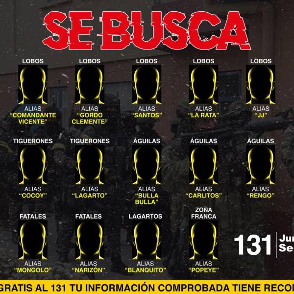 El plan de recompensas publicó la lista de los 19 líderes de organizaciones terroristas que son buscados por el Ecuador. El listado está encabezado por Fabricio Colón Pico, alias capitán Pico, autor, según la fiscal Diana Salazar, de un plan para asesinarla. Se encuentra prófugo tras escapar de la cárcel de Riobamba el lunes.
