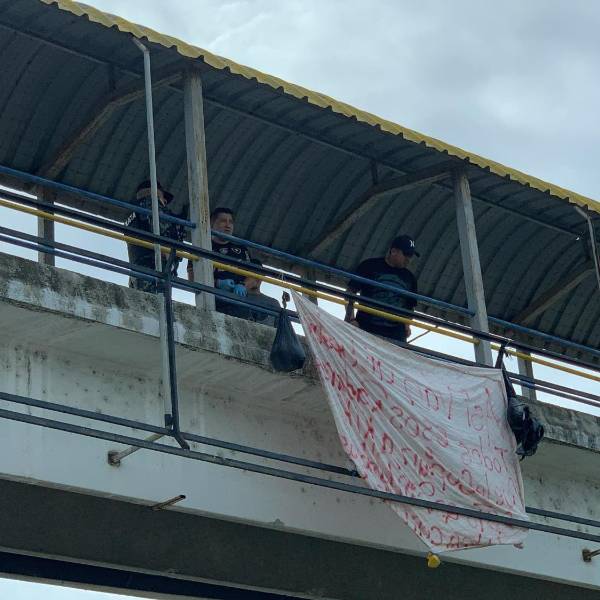 Imagen de una pancarta y dos restos humanos colgados en un paso peatonal de Puerto Bolívar, Machala.( )