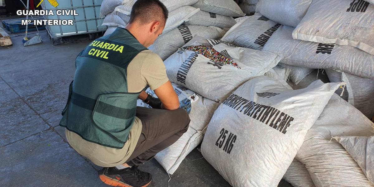 Un agente de la Guardia Civil revisa uno de los sacos de escamas multicolor de PET "tereflalato de polietileno", incautados. EFE/ Guardia Civil