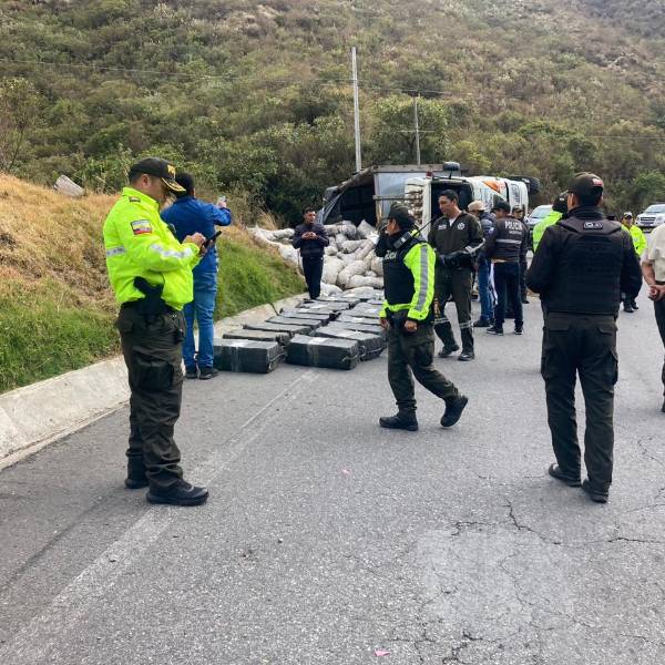 Un camión se volcó la mañana de este miércoles 11 de octubre del 2023 en el kilómetro ocho de la vía Pifo-Papallacta, que conecta Quito con la Amazonía ecuatoriana, y dejó caer varios paquetes rectangulares que resultaron contener droga.