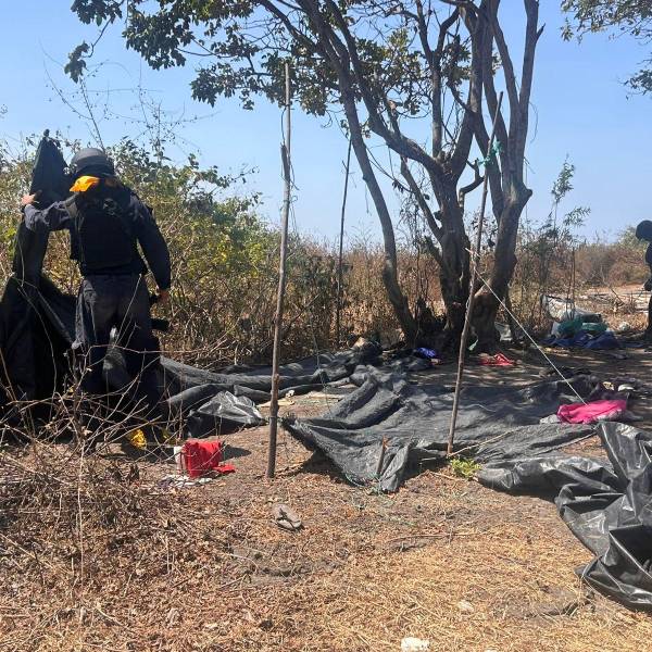 Tras la maraña de mangle estaban tres chozas improvisadas, sacos apilados como trincheras con impactos de bala, garitas camufladas, ropa y enseres abandonados. Era un refugio rudimentario.