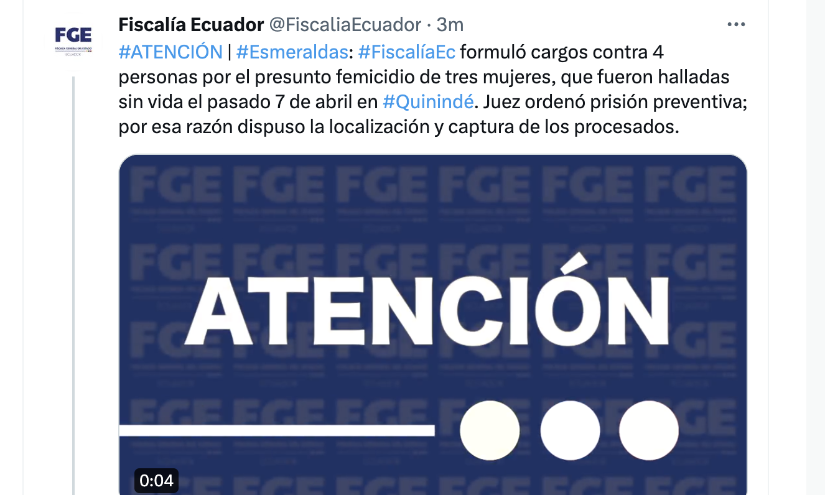 Casi dos meses después del triple femicidio ocurrido el pasado 6 de abril de 2023, se llevó a cabo hoy, desde las 08:30 de la mañana, en Esmeraldas, la audiencia de formulación de cargos en contra de cuatro sospechosos.