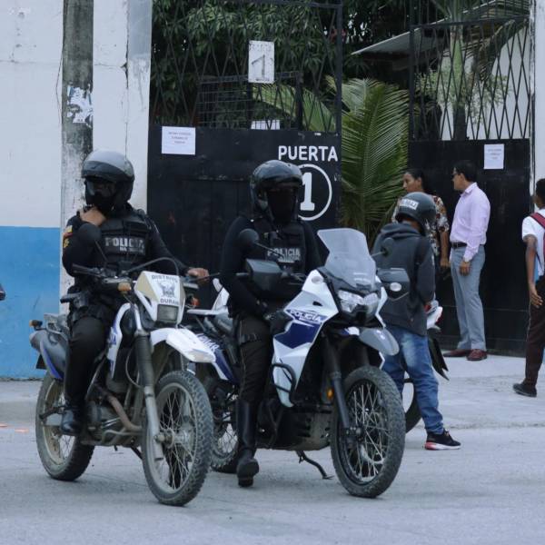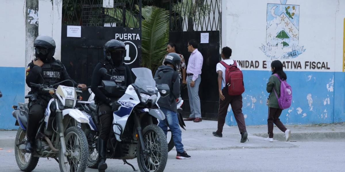 Miembros policiales brindan seguridad en los exteriores de una unidad educativa en Durán. ( )