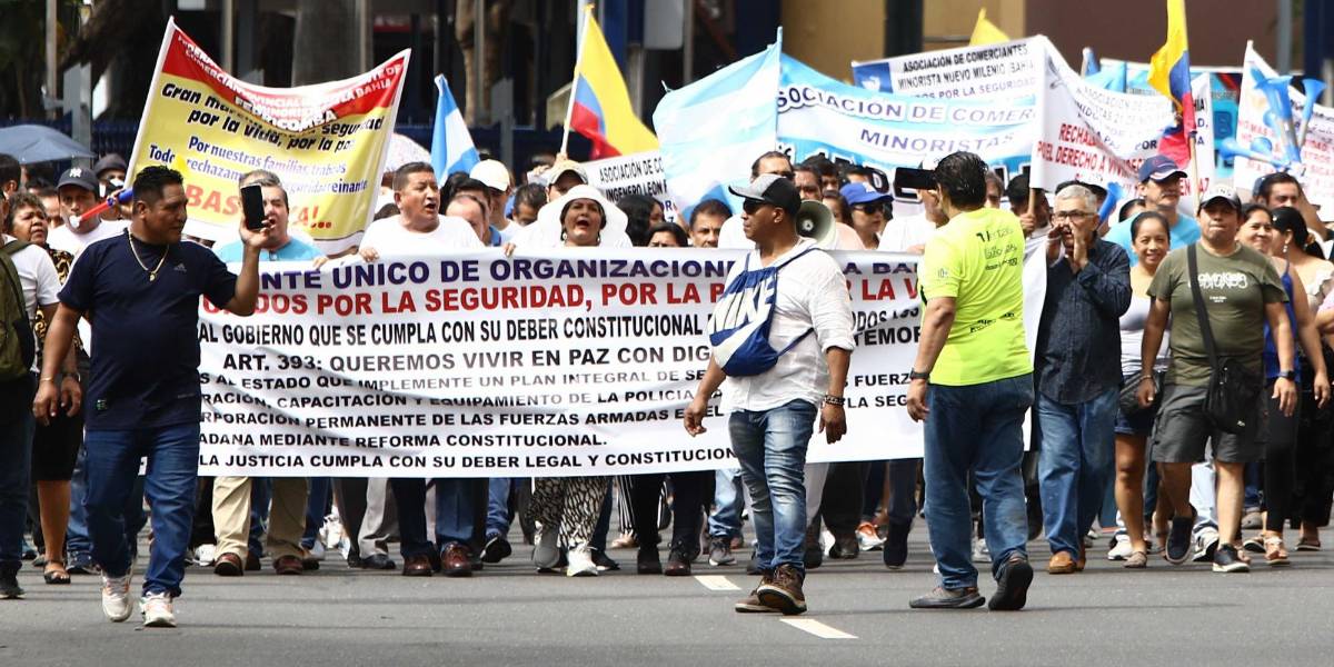 Comerciantes de la Bahía y de la calle Ayacucho marcharon este miércoles 12 de abril por el centro y suroeste de Guayaquil, respectivamente, para pedir al Gobierno Nacional que aplique medidas de seguridad más contundentes para contener los robos, secuestros y extorsiones en sus sectores.