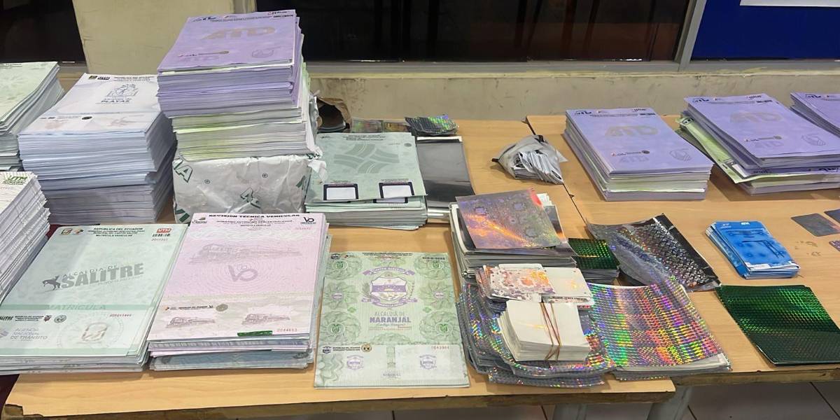 El ministro del Interior, John Reimberg, informó este martes 28 de octubre del decomiso, en Durán, de más de 22 000 documentos de tránsito de 28 cantones del país. Entre los indicios hallados, había certificados de revisión técnica vehicular, stickers que validan una matriculación y decenas de sellos.