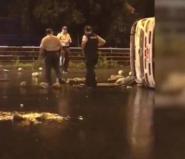Dos delincuentes armados se enfrentaron a la Policía la madrugada de este miércoles 27 de diciembre en Santo Domingo, después de robar un camión de frutas, que quedó volcado tras una persecución.