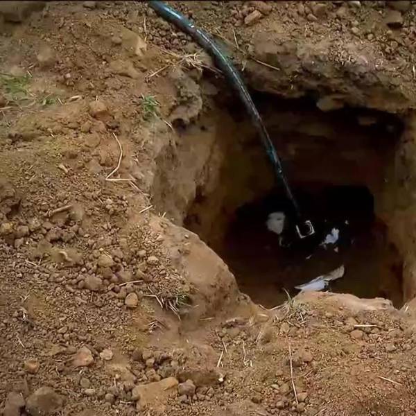 Desde el cielo un drone guió a la cuadrilla hasta una zanja abierta con huellas recientes. La búsqueda del punto exacto de perforación tomó más de tres horas.