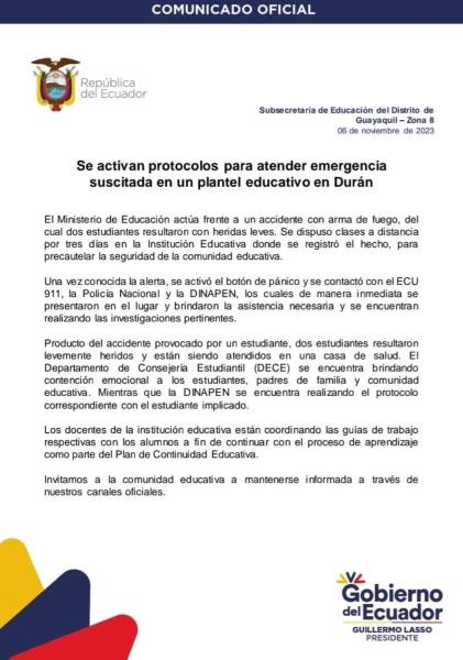 El Ministerio de Educación dispuso clases a distancia por tres días en un colegio de Durán donde dos estudiantes quedaron heridos por un accidente de arma de fuego que llevó un alumno a la institución.