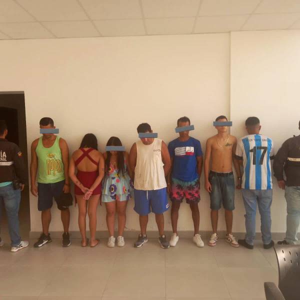 Imagen provista por la Policía Nacional en una captura realizada en Manta el domingo 16 de julio donde se observa a 7 personas detenidas.( )