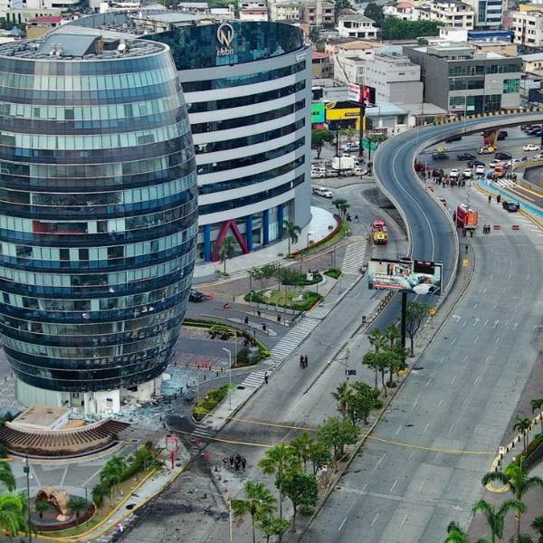 Con la luz del día, son más evidentes los daños producto de la explosión de un coche bomba frente a un centro comercial de Guayaquil. Los ventanales de dos edificios quedaron destruidos.