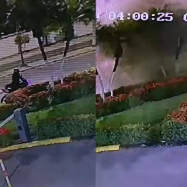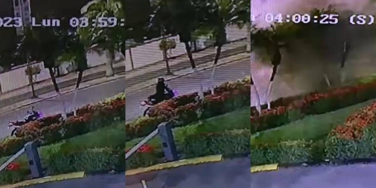 La explosión ocurrió a las 04:00. Una cámara de videovigilancia captó el momento en que el sujeto puso el petardo junto a una jardinera e inmediatamente huye del sitio. Instantes después sucede la detonación.
