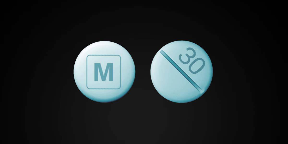 El fentanilo ilegal viene como pastillas que generalmente son de color azul, marcadas con una señal que dice M30. ( )