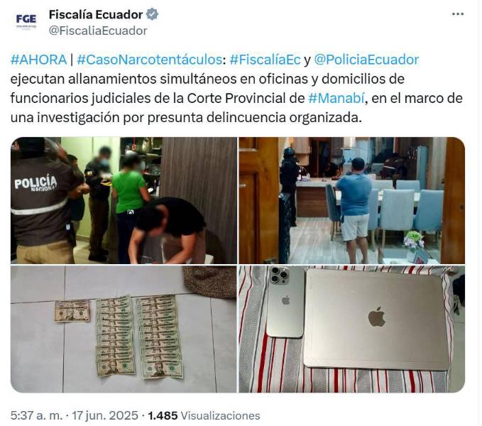 La Fiscalía General del Estado y Policía Nacional ejecutaron nuevos allanamientos simultáneos la madrugada de este martes 17 de junio en oficinas y domicilios de funcionarios judiciales de la Corte Provincial de Manabí en el marco del caso Narcotentáculos.
