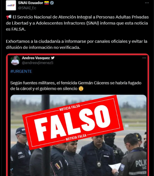 El comunicado surgió luego de una publicación en redes sociales, en el que se mencionaba que Cáceres se había fugado de la cárcel Regional Cotopaxi, donde cumple una sentencia de 34 años y ocho meses.