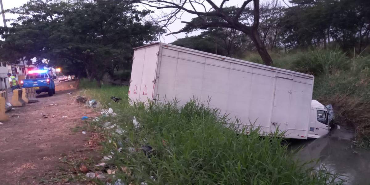 Un camión terminó parcialmente sumergido en una zanja de la ciudadela Guayacanes, en el norte de Guayaquil, tras chocar a cuatro vehículos y una carreta de comidas, pero sin dejar víctimas mortales o heridos. Este suceso ocurrió la madrugada de este lunes 22 de agosto.