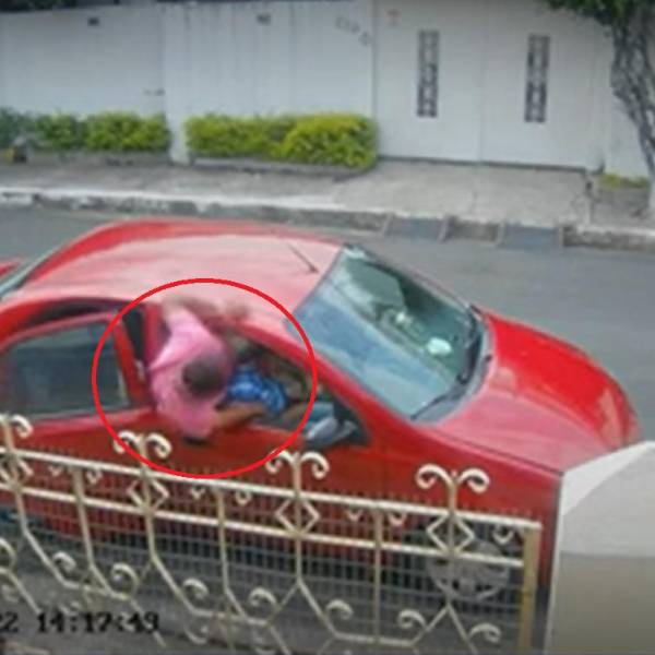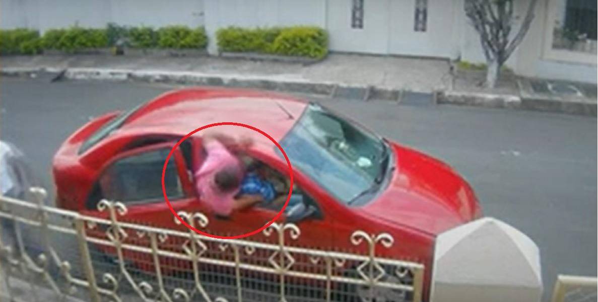 Cámaras captan cómo el conductor de un auto logró escapar de dos ladrones que lo habían secuestrado. El hombre estaba en el asiento trasero del carro, cuando se ve que hace una maniobra para forcejear con un sujeto armado que iba como copiloto, logrando salir por la ventana.