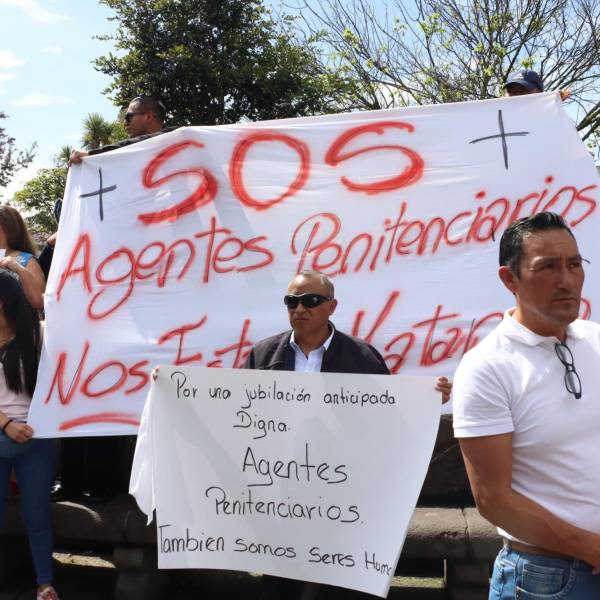 Docenas de guías penitenciarios y sus familiares se concentraron la mañana de este martes 8 de abril en la Plaza Grande del Centro Histórico de Quito para exigir garantías en sus trabajos.