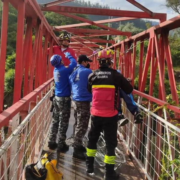 Rescatistas y paramédicos de los Bomberos de Ibarra bajaron el cuerpo que estaba colgado en un puente.