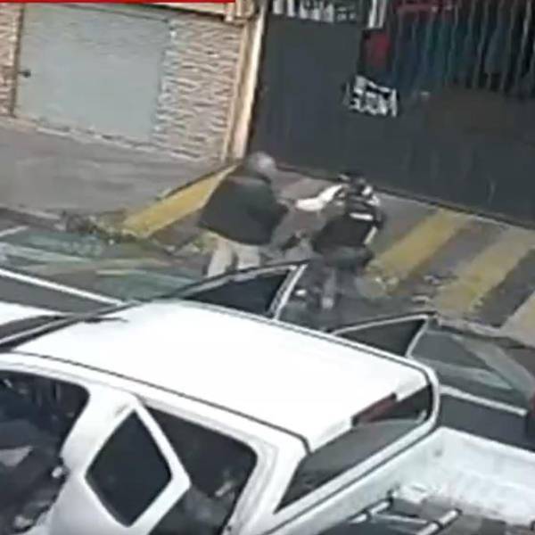 Forcejean. La víctima va al piso, sin embargo, el asaltante no lo suelta y es ahí cuando de una camioneta que pasaba en ese momento se bajan cuatro uniformados y someten al presunto delincuente.