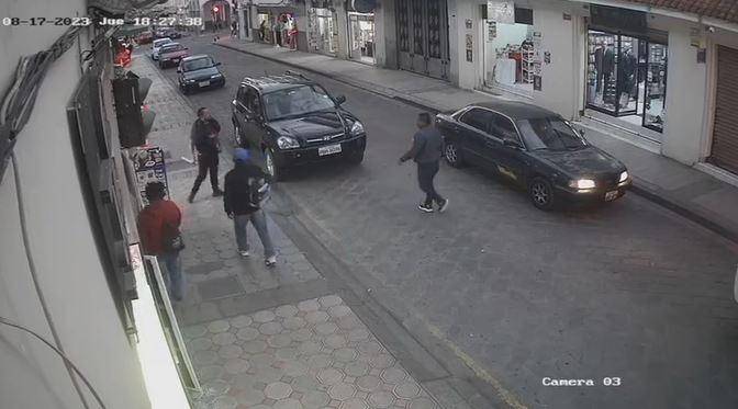 Las imágenes son impactantes. A las 18:27 del jueves, 17 de agosto de 2023, dos hombres salen de una carnicería ubicada entre las calles San Miguel y Gaspar Sangurima, en el Centro Histórico de Cuenca. La discusión continúa en plena vía.