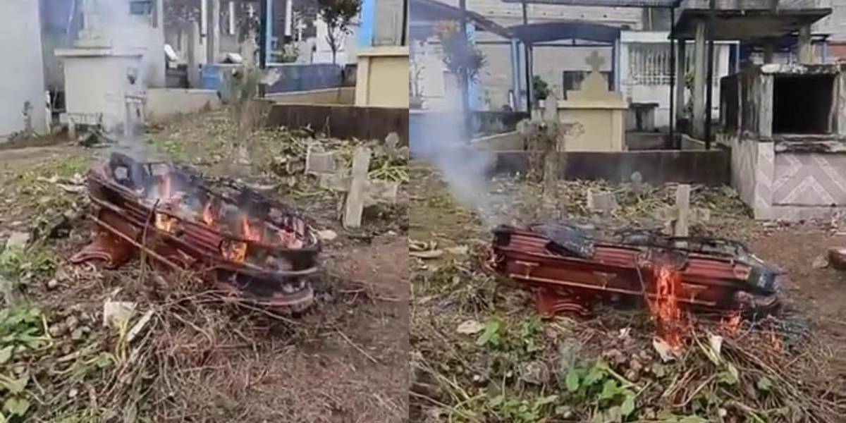 De acuerdo a portales de noticias locales, los sujetos prendieron fuego al féretro de madera para abrirlo y guardaron los restos humanos en una funda. Al huir, dejaron que las llamas sigan quemando el ataúd.