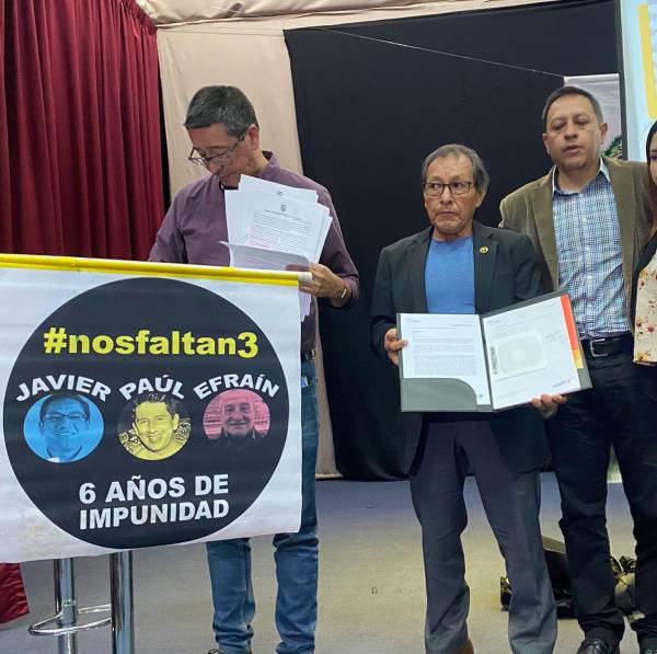 Los familiares del reportero Javier Ortega, fotógrafo Paúl Rivas y conductor Efraín Segarra, dieron una rueda de prensa este viernes 17 de mayo de 2024 para informar sobre los hallazgos encontrados en los fragmentos de las actas 18, 19 y 20 del Consejo de Seguridad Pública y del Estado (Cosepe), las cuales corresponden a marzo y abril de 2018.