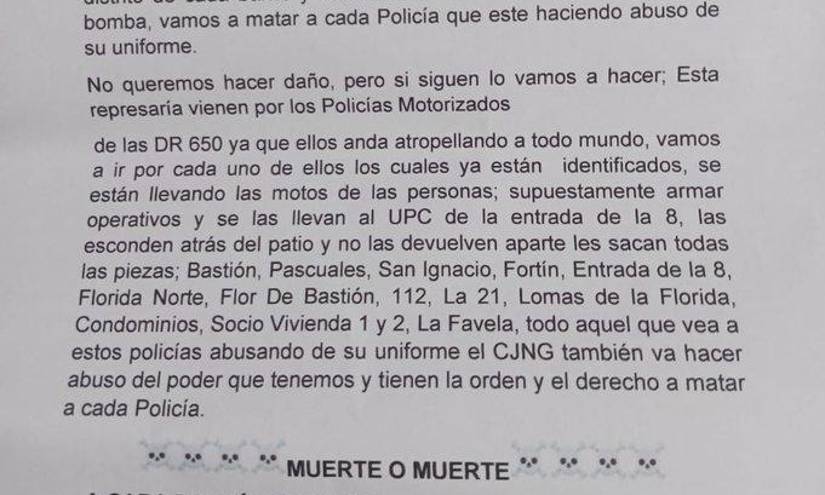 “Si las autoridades de alto mando no toman cartas en el asunto, tengan la certeza que uno por uno van a quedar muertos, vamos a ir por cada UPC de cada distrito de cada barrio y le vamos también hacer la judía con carros bomba, vamos a matar a cada policía que esté haciendo abuso de su uniforme”, advierten en el documento.