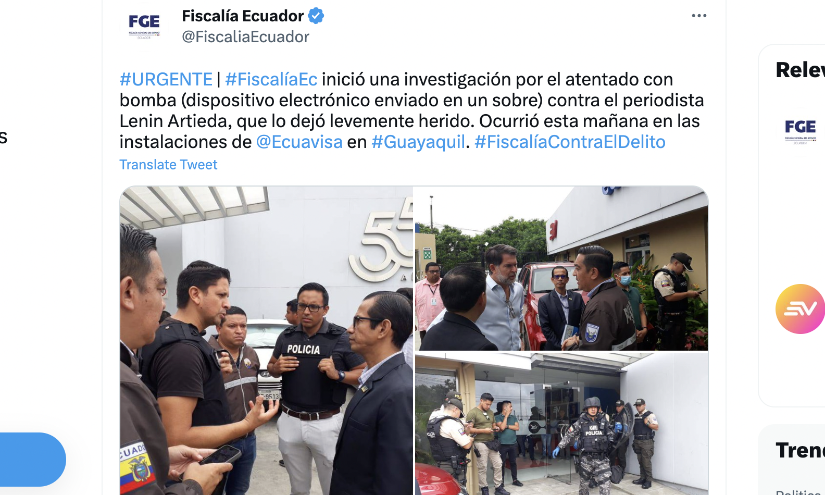 Lenin Artieda: Fiscalía abre investigación tras atentado con explosivo en Ecuavisa