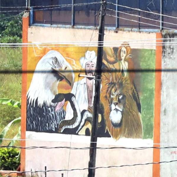 Imagen de un mural referente a Los Choneros, con un águila, un león y alias Fito, en la cárcel Regional de Guayaquil. Foto tomada en agosto de 2023.( )