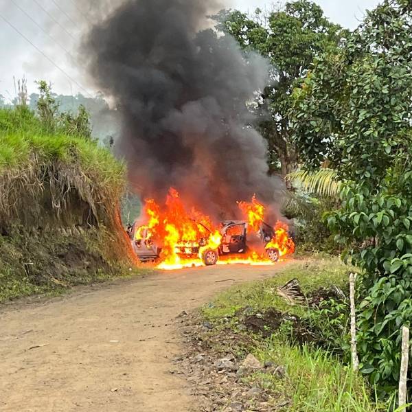 Dos vehículos quemados, y manifestantes y policías heridos en Palo Quemado, Cotopaxi durante protestas antimineras