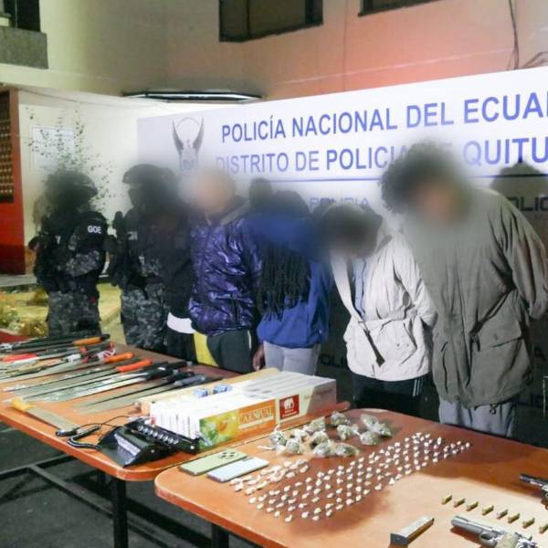Un megaoperativo fue ejecutado la noche del martes 12 de agosto en el sector Martha Bucaram, circuito La Ecuatoriana, sur de Quito, que dejó a siete presuntos integrantes de Los Lobos detenidos, además de una incautación de armas, droga y la recuperación de vehículos robados.