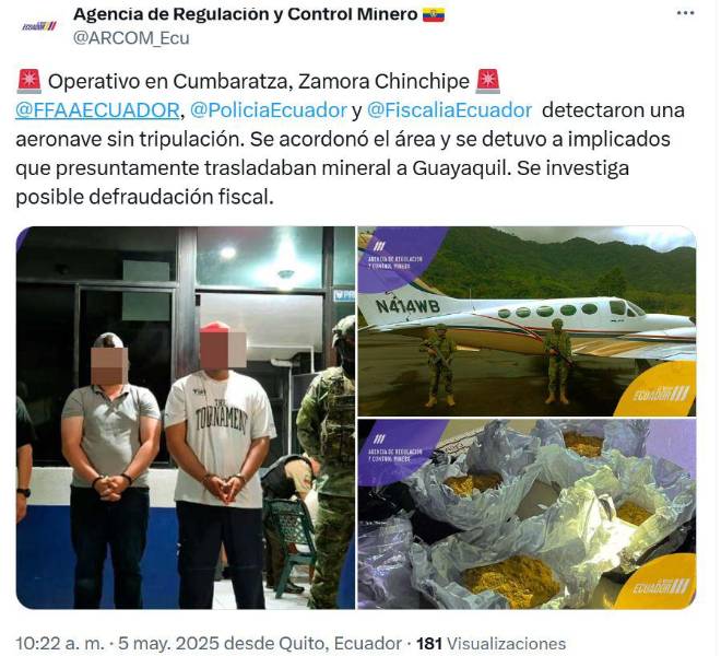 La Agencia de Regulación y Control Minero dijo que los aprehendidos serán investigados por una posible defraudación fiscal.