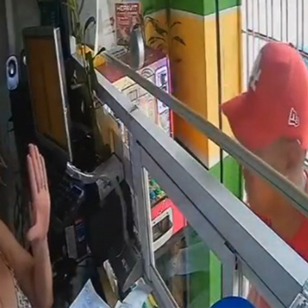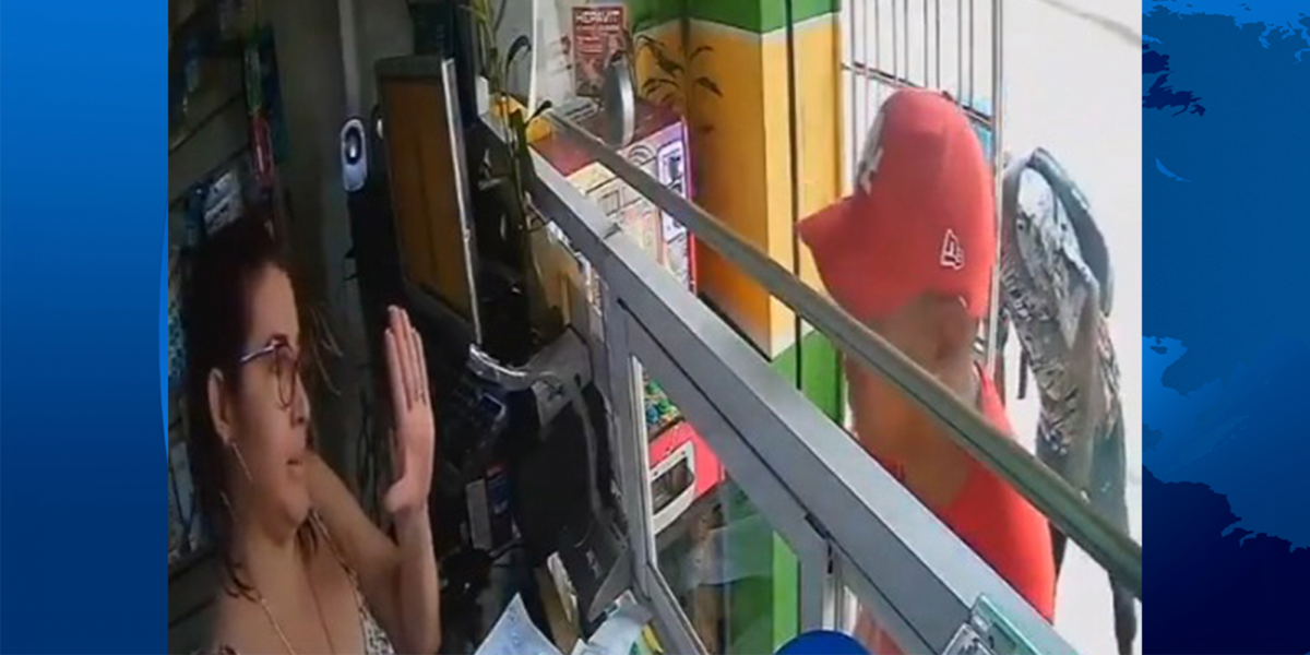 Durante el enfrentamiento, la mujer abre la caja registradora y saca 10 centavos, para entregárselos al presunto delincuente. "Esto me va a dar", dice el hombre.