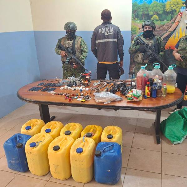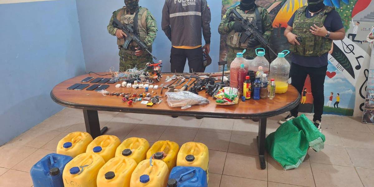 Entre los objetos decomisados constan ocho teléfonos celulares, 16 pipas de elaboración artesanal, 10 objetos cortopunzantes, una funda con sustancias sujetas a fiscalización y 10 canecas plásticas con licor artesanal.