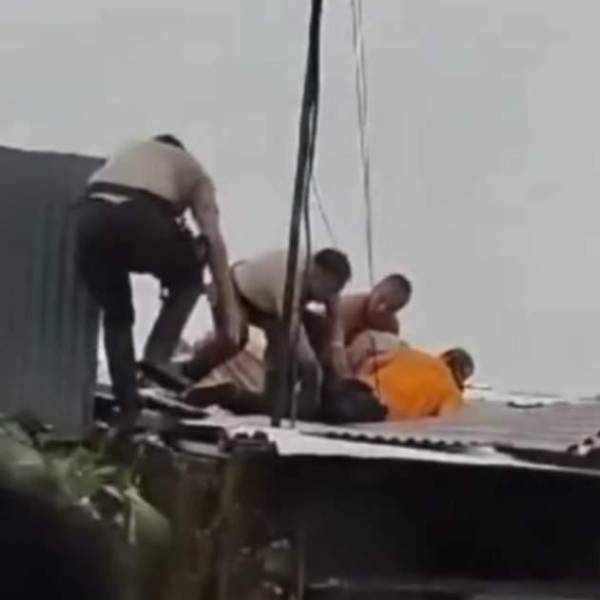 El sujeto, que actuaba bajo el efecto del licor, los policías y los demás ciudadanos avanzaron hasta el techo de zinc de una propiedad, que terminó colapsando. Las personas cayeron de una altura de más de dos metros en medio del asombro de los moradores quienes grabaron la escena.