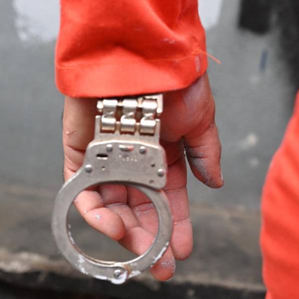 Imagen de un preso caminando con una esposa solo puesta en una mano. Foto tomada en Honduras.( )