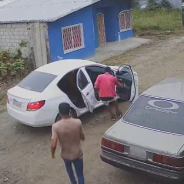 En los videos se observa que están dos personas paradas junto a una vía. Llega el auto blanco y se bajan los dos ladrones, mientras otro espera para escapar. Una de las víctimas logra escapar pero otra es sometida.