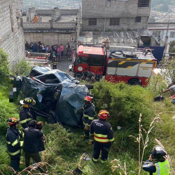 Un vehículo liviano se volcó y cayó a un terreno baldío. Una persona falleció tras el incidente. Personal del Cuerpo de Bomberos de Quito, Agencia Metropolitana de Tránsito y Policía Nacional atendieron la emergencia.