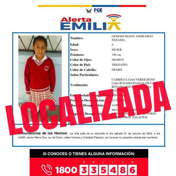 La Fiscalía General informó que la niña Génesis Maité Andrango Panamá, de nueve años, fue localizada con vida este miércoles 25 de octubre, después de que en la víspera se activara la Alerta Emilia por su desaparición.