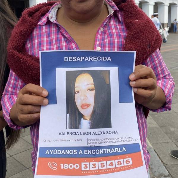 Alexa Sofía Valencia León, de 16 años, continúa desaparecida. Fue vista por última vez el pasado 19 de marzo en Quito, provincia de Pichincha, en el sector del Camal Metropolitano, ubicado en la calle María Viera y La Hoya.