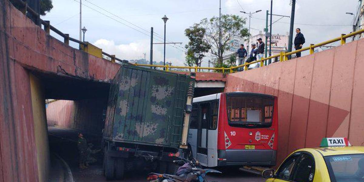 Un siniestro ocurrió, la mañana de este lunes 20 de marzo de 2023, en el sector de San Blas en el Centro Histórico de Quito . Un camión militar se impactó contra el paso deprimido ubicado en la avenida Pichincha.