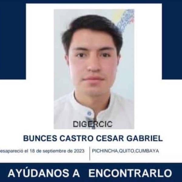 El entrenador de fútbol César Gabriel Bunces Castro, de 24 años, se encontraba desaparecido desde la mañana del lunes 18 de septiembre de 2023, en la parroquia de Cumbayá, oriente del Distrito Metropolitano de Quito.
