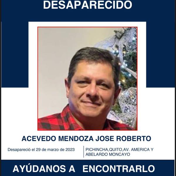 Equipos de la Policía Nacional se activaron para localizar a José Roberto Acevedo Mendoza, de 53 años, quien está desaparecido. Lo último que se supo del empresario textil quiteño es que a las 17:00 de ayer, miércoles 29 de marzo de 2023, dejó a una de sus empleadas en la avenida Occidental, a la altura del Colegio Los Pinos, y luego tenía una reunión con un cliente.