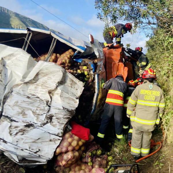 Un camión se impactó contra una peña, informó el Cuerpo de Bomberos de Quito (CBQ). Una persona murió y otra resultó afectada.