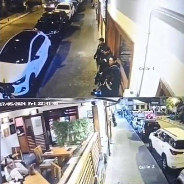 En las imágenes se observa que dos sujetos ingresaron al restaurante y amenazaron con armas de fuego a los comensales. Los individuos quitaron celulares, cadenas y otras pertenencias. Segundos después salen caminando del local y se trepan en dos motocicletas que eran conducidas por otros dos individuos. Finalmente, huyen del lugar.