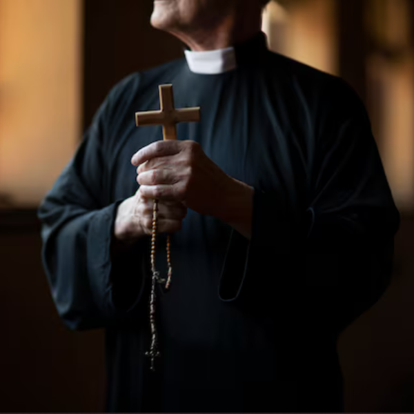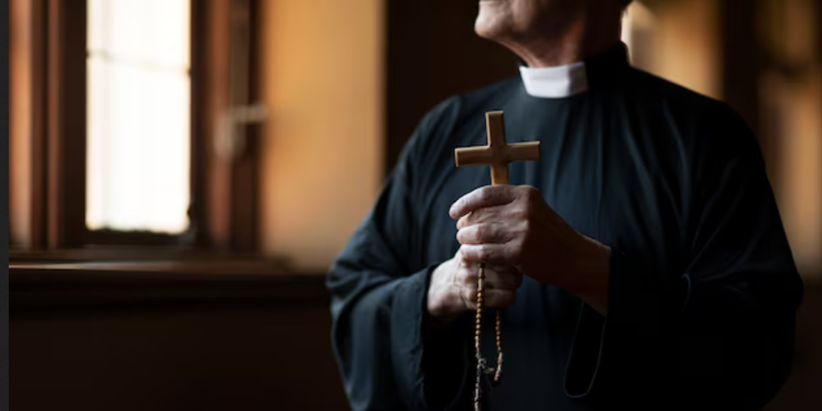 Imagen de archivo de un sacerdote sosteniendo una cruz.( )