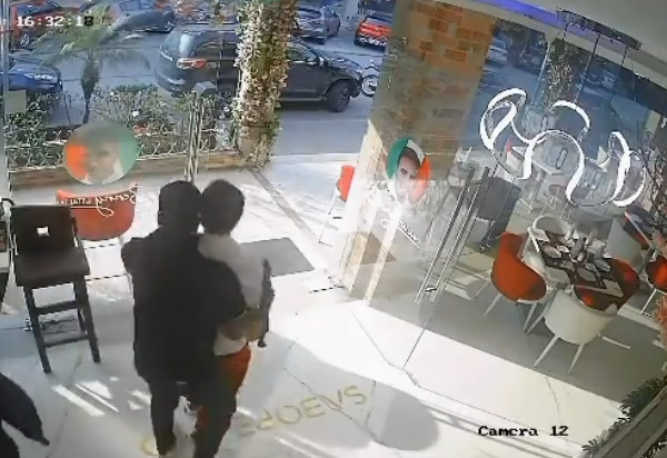 En éste se observa que dos hombres ingresaron al restaurante a buscar al extranjero, mientras que otros tres (dos de ellos con indumentaria similar a la de un policía) vigilan los exteriores del negocio.