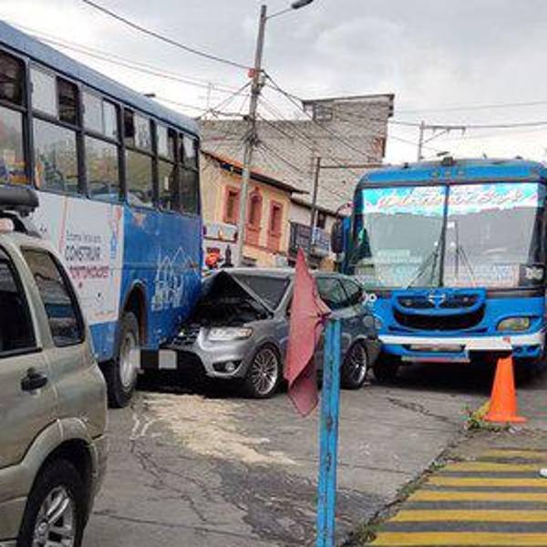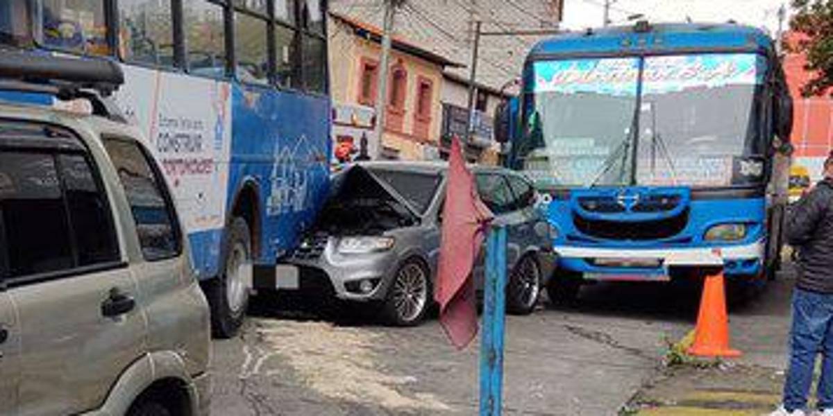 Un vehículo liviano quedó atrapado entre dos buses de transporte urbano. El Cuerpo de Bomberos (CBQ) informó que dos personas resultaron afectadas y recibieron atención prehospitalaria.