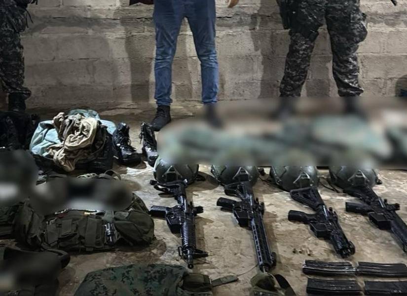 Los uniformados encontraron en una vivienda, y en una plantación de banano, ocho fusiles, cuatro pistolas, tres escopetas, 11 celulares, cascos balísticos, guantes tácticos y prendas similares a uniformes de las fuerzas del orden.